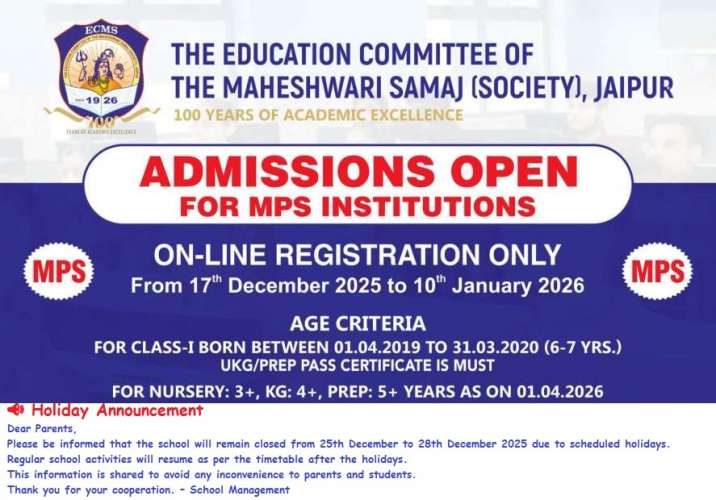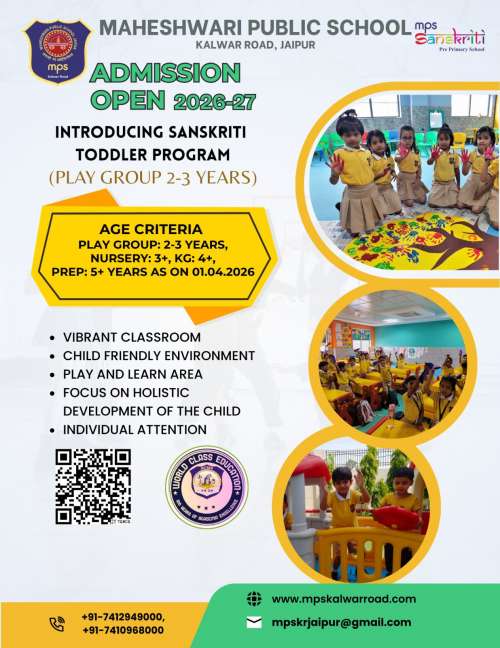 Maheshwari Public School, Kalwar Road, Jaipur, is a premier educational institution dedicated to providing a balanced blend of academic excellence, cultural enrichment, and personal growth. Established with a vision to nurture young minds and empower them to become responsible global citizens, MPS Kalwar Road continues to uphold the rich legacy of the Maheshwari Samaj in promoting quality education with moral and ethical values.